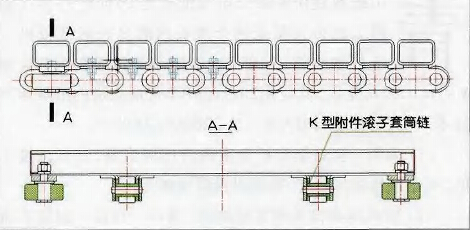 原平板输送链条的结构如图2,链条由带K型附件的滚子套筒链和方管钢面板组成,链条传动时,套筒沿着轴滑动,增加了功率的消耗。